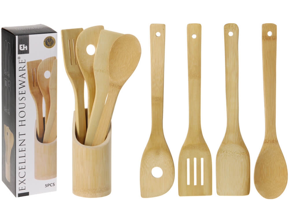 Σετ Ξύλινες Κουτάλες Κουζίνας Excellent Houseware από Μπαμπού με Βάση Αποθήκευσης, 5 τεμαχια