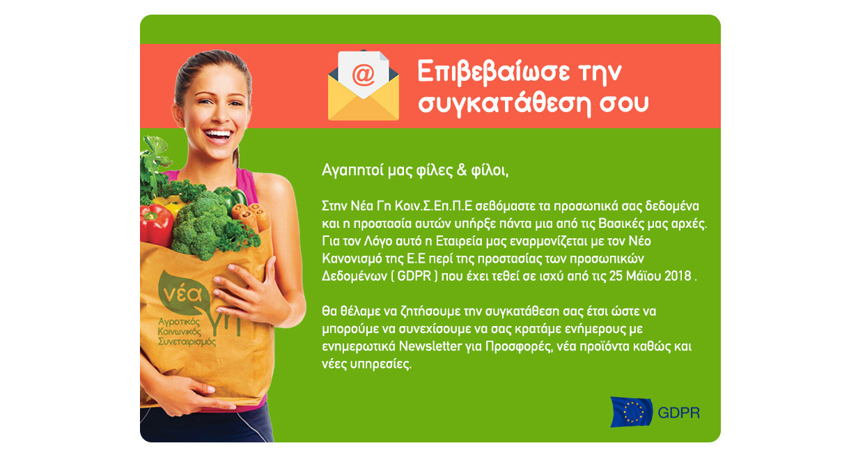 Ως Υπεύθυνος Επεξεργασίας η Κοιν.Σ.ΕΠ Νέα Γή με Α.Φ.Μ 997598329, έδρα στην Ερυθρές Αττικής, Εθν. Αντιστάσεως 2, Τ.Κ. 19008, email: